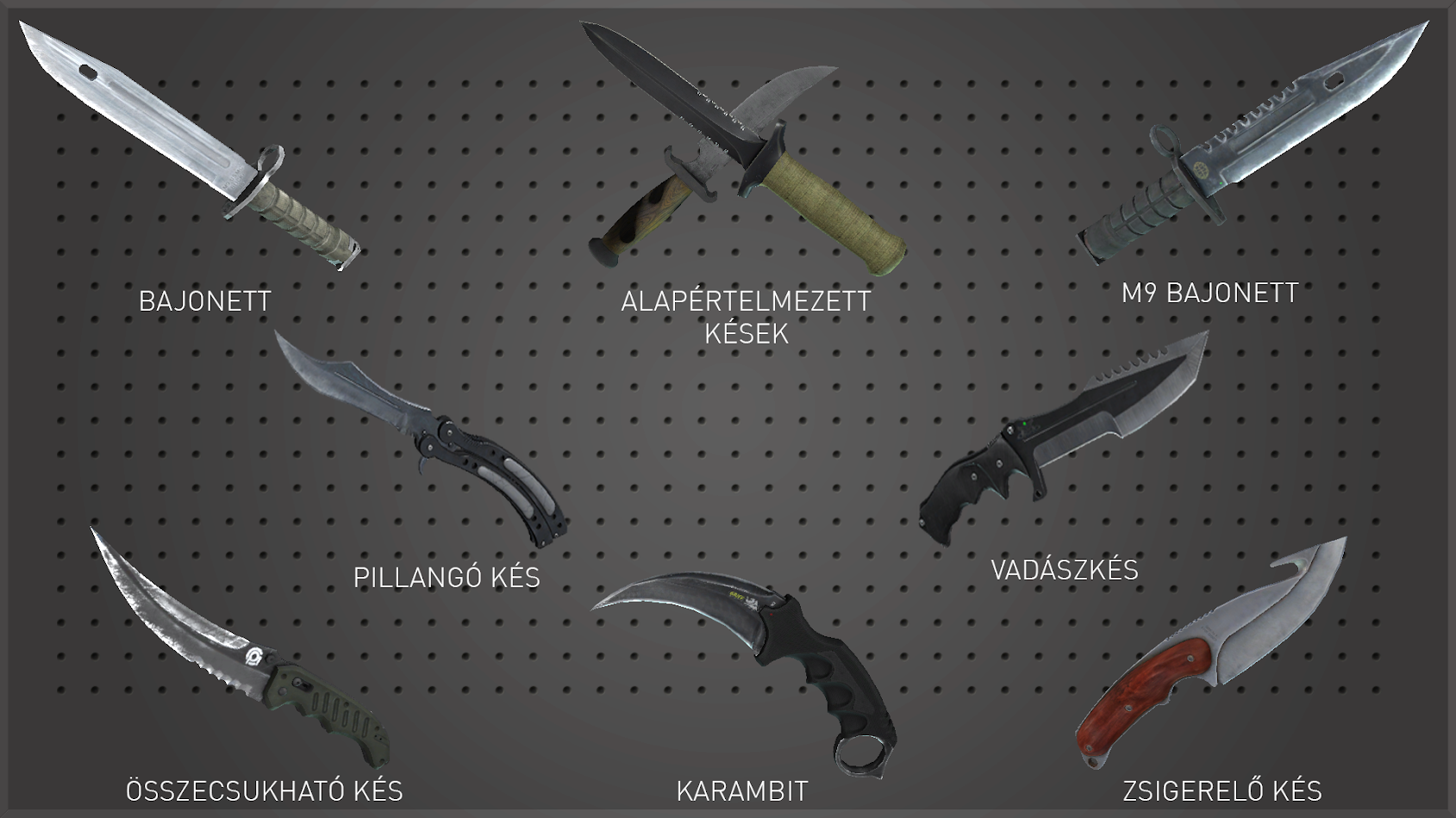 A kések az ütés szerepét helyettesítik. Ezeknek több variációja is van, melyből csak kettő tartozik az alapértelmezettek közé. A többi egyedi, melyeket a Steam Közösségi Piacról vehetünk meg vagy láda nyitásból nyerhetünk.
